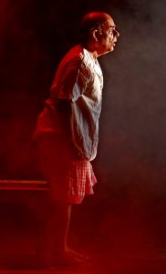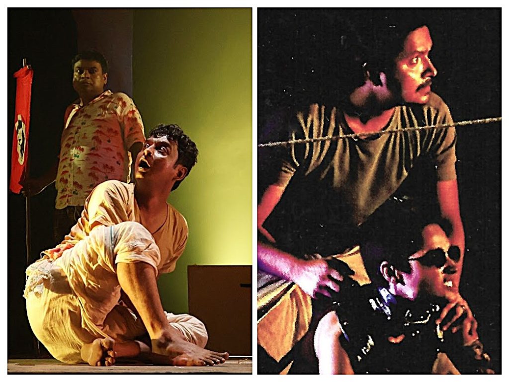 Bitanbindu Bandyopadhyay’s portrayal of the eccentric Gajapati (photo alongside) fixated on hybridizing a black hibiscus confirms his position as Sanglap’s finest but under-recognized actor, here evoking shades of the inimitable Satya Bandopadhyay. Kaushik Ray brings more direct laughter as Gajapati’s mischief-making house help. Dhrubo Mukherjee acts Kalicharan (top right, with his dog) realistically rather than mysteriously, and Soumen Chakraborty makes the hitman Shadow an even more gritty depiction of desperation in dire domestic straits. Debasish’s direction bears his trademark touches—a mid-backcloth cut out with passageways upstage, acoustic music, inventive use of chairs to imitate a train running on tracks—but visible stagehands behind set pieces of trees looks amateurish, and Shadow tossing a teacup into the wings flouts environmental consciousness.