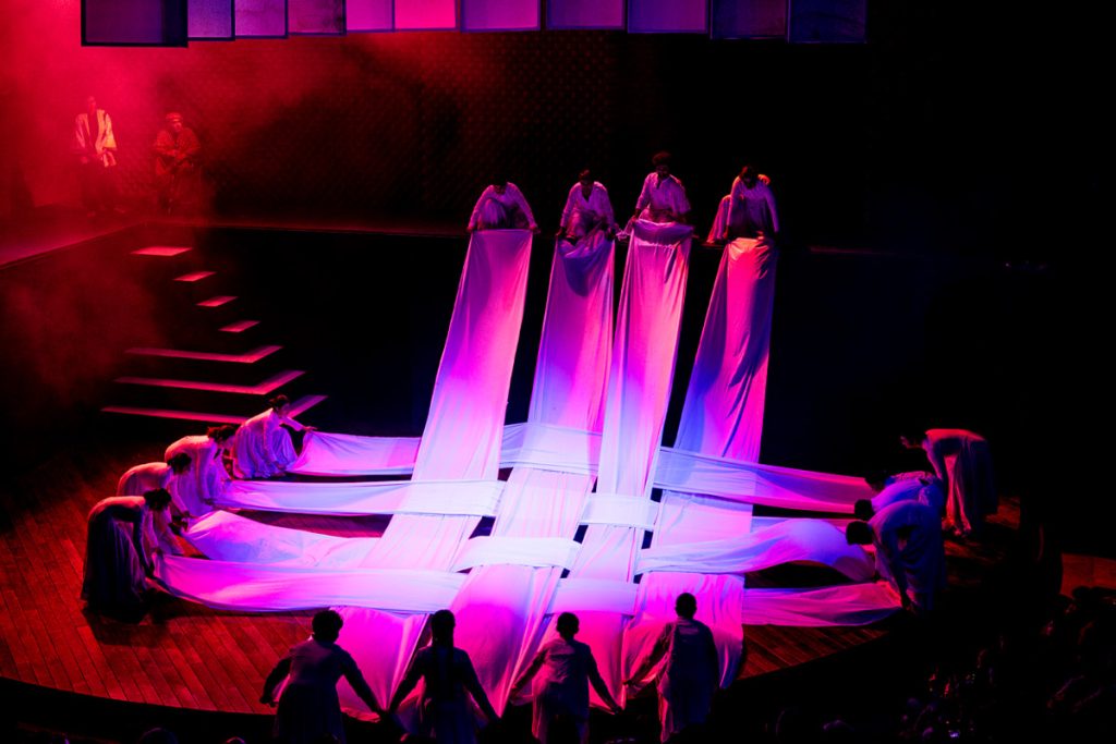 Celebrating Darpana’s 75th anniversary, Meanwhile Elsewhere resembled poetry and painting in motion onstage. Writer-director Yadavan Chandran, inspired by Italo Calvino’s postmodern novel Invisible Cities, matched its dreamy yet intricately mathematical patterns typical of the Oulipo movement with his own lambent lighting and sound, Mallika Sarabhai’s geographically diverse costumes and the mathematically aesthetic virtues of dance, choreographed collectively by Sarabhai, Lucrezia Maniscotti and Penelope Deen. Creating breathtaking visuals like the interwoven warp and weft in the photo above, in the tradition of such pioneers as Robert Wilson’s “Theatre of Images”, it lived up to its caption of artistic fragility: “To pull one thread is to fray the whole”. One must simply allow oneself to immerse in the experience.